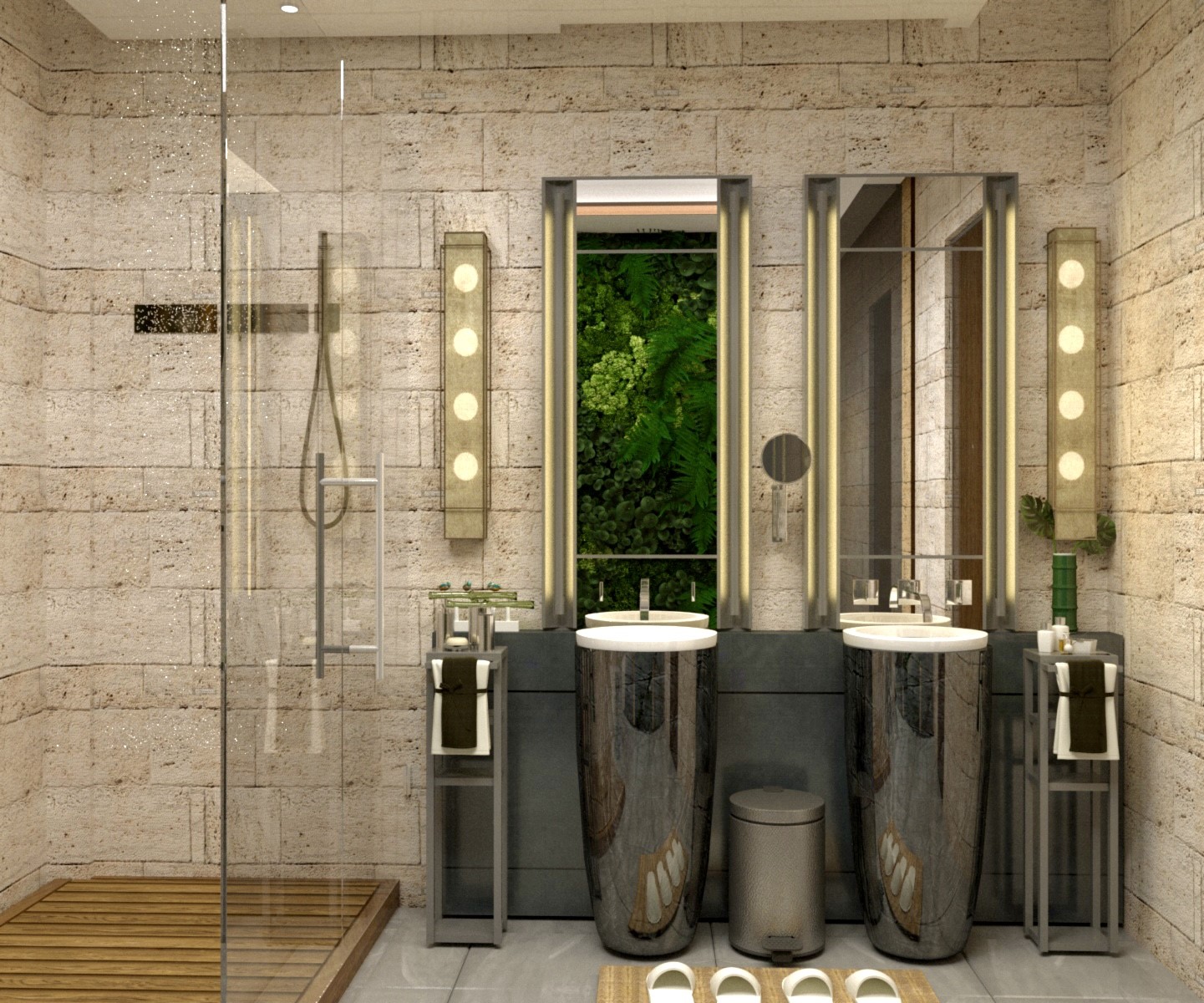Endüstriyel banyo tasarımı, endüstriyel tarzın karakteristik özelliklerini banyo alanına uyarlayan bir tasarım yaklaşımıdır. Bu tarza uygun olarak banyomuz tasarlanmıştır. Endüstriyel tasarım, metal, beton, tuğla gibi endüstriyel malzemeleri vurgular. Duvarlarda açık tuğla, metal yüzeyler ve paslanmaz çelik armatürlerle tarztamamlanmıştır. Genellikle renk olarak nötr ve toprak tonları tercih edilir. Siyah, gri, beyaz ve kahverengi gibi renkler endüstriyel tarzın ana renkleri olarak kullanılabilir. Kurallara uygun renk kombinlemesi yapıldı. Mobilya tercihinde minimalist ve fonksiyonel mobilyalar tercih edildi. Endüstriyel tarz, çelik musluklar, metal sabunluklar, endüstriyel tarzda havluluklar gibi detaylar kullanıldı. Endüstriyel hissiyatı artırmak için endüstriyel tasarıma sahip aksesuarlar tercih edildi.Endüstriyel tasarım, minimalist bir yaklaşıma sahiptir. Bu sebeple mekanda gereksiz kalabalıktan kaçınıldı.Endüstriyel tasarımda bazen doğal unsurlar da kullanılabilir. Bitkiler veya doğal taşlar gibi dokusal ve renkli detaylar, mekana denge katar. Bu sebepten ötürü duvarda yapay dikey bahçe kullanıldı. Endüstriyel tarz, doğal ve endüstriyel unsurların harmanlandığı etkileyici bir estetik sunar. Bu önerileri kullanarak, banyomuzda çağdaş ve karakteristik bir endüstriyel tasarım anlayışıyla donatılmıştır.