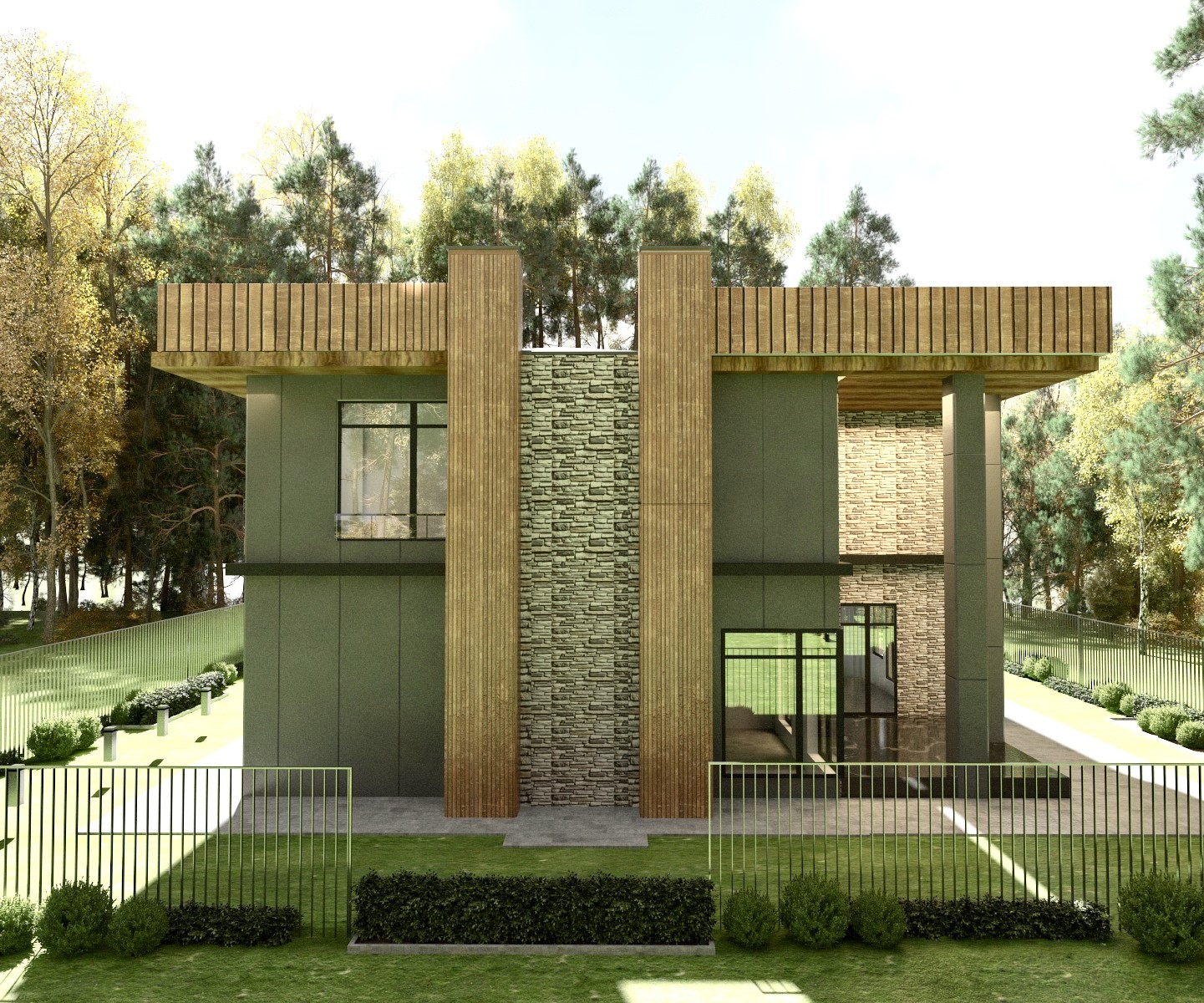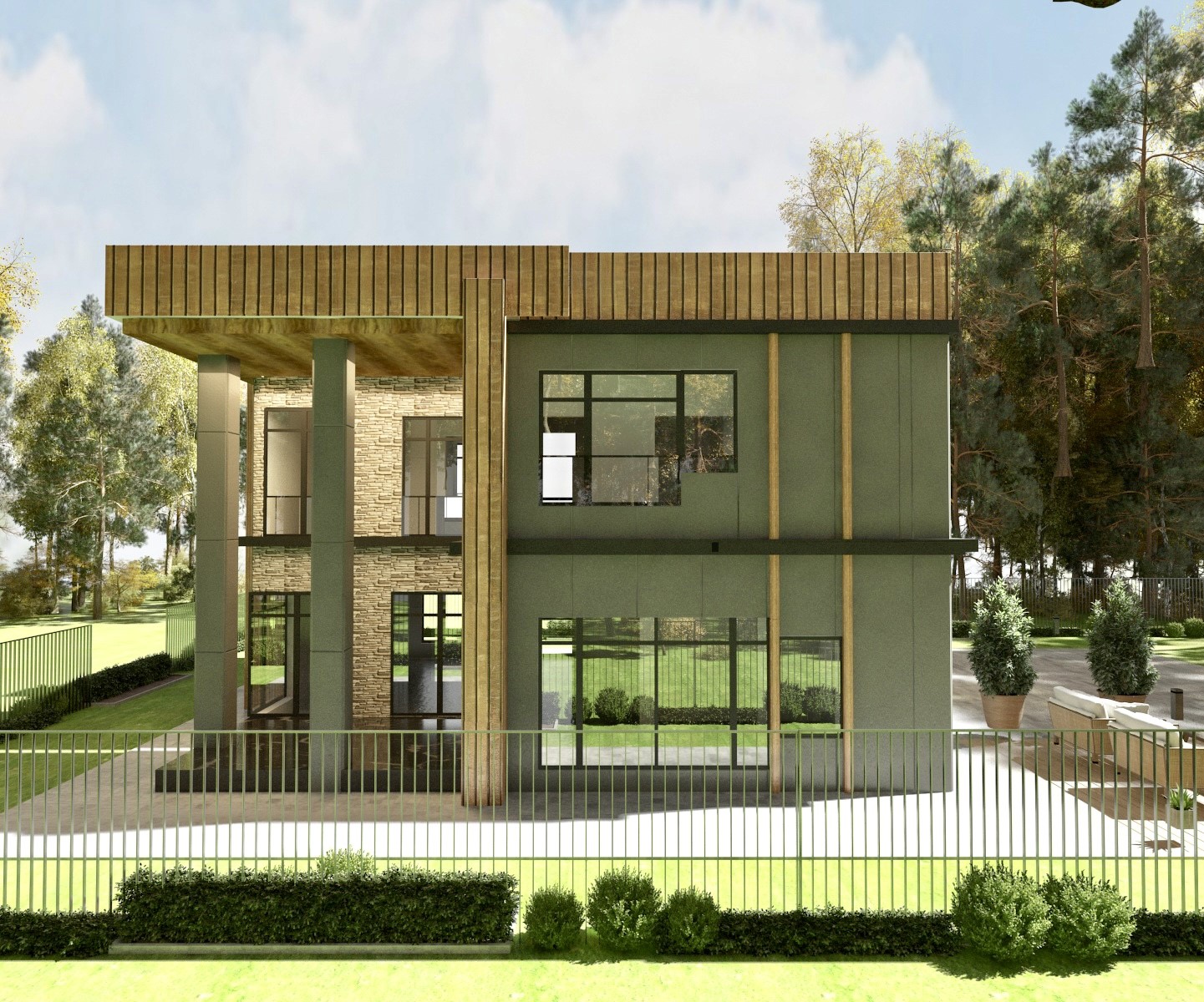 Modern ve minimalist bir dış cephe tasarımı, temiz hatlar, sade renk paleti ve işlevsel detaylarla karakterize edilir. Minimalist tasarımın anahtarı düz ve temiz hatlardır.Gri, rengi kullanarak sade ve modern bir estetik yakalandı. Ahşap ve cam gibi doğal ve endüstriyel malzemeleri bir araya getirerek modern bir dış cephe oluşturuldu. Ahşap dokular ve beton yüzeyler minimalist tarza uygun olabilir.Büyük pencereler, açık alanlar ve sade tasarımlı kapılar kullanarak iç ve dış mekanlar arasında akıcı bir geçiş sağlanabildi. Asimetrik düzenlemeler modern minimalist tasarımda sıkça kullanılır. Ancak simetrik düzenlemeler de şık ve dengeli bir görünüm sağlanmaya çalışıldı.Minimalist bir dış cephe tasarımında düz ve sade yüzeyler tercih edildi. Dış cepheyi fazla dekore etmek yerine, seçtiğiniz malzemeler ve detaylarla etkileyici bir görünüm yaratmaya odaklanıldı. Büyük cam yüzeyler hem modern bir görünüm sağlar hem de iç mekanı dışarıyla daha fazla bağlar. Bu aynı zamanda doğal ışığın içeri girmesini de kolaylaştırdı. Modern ve minimalist bir dış cephe tasarımı oluştururken işlevselliği, sadeliği ve estetiği dengelemeye özen gösterildi. Tasarımın bütününü düşünerek nötr renkler, temiz hatlar ve işlevsel detaylarla etkileyici bir sonuç elde edilmiştir.