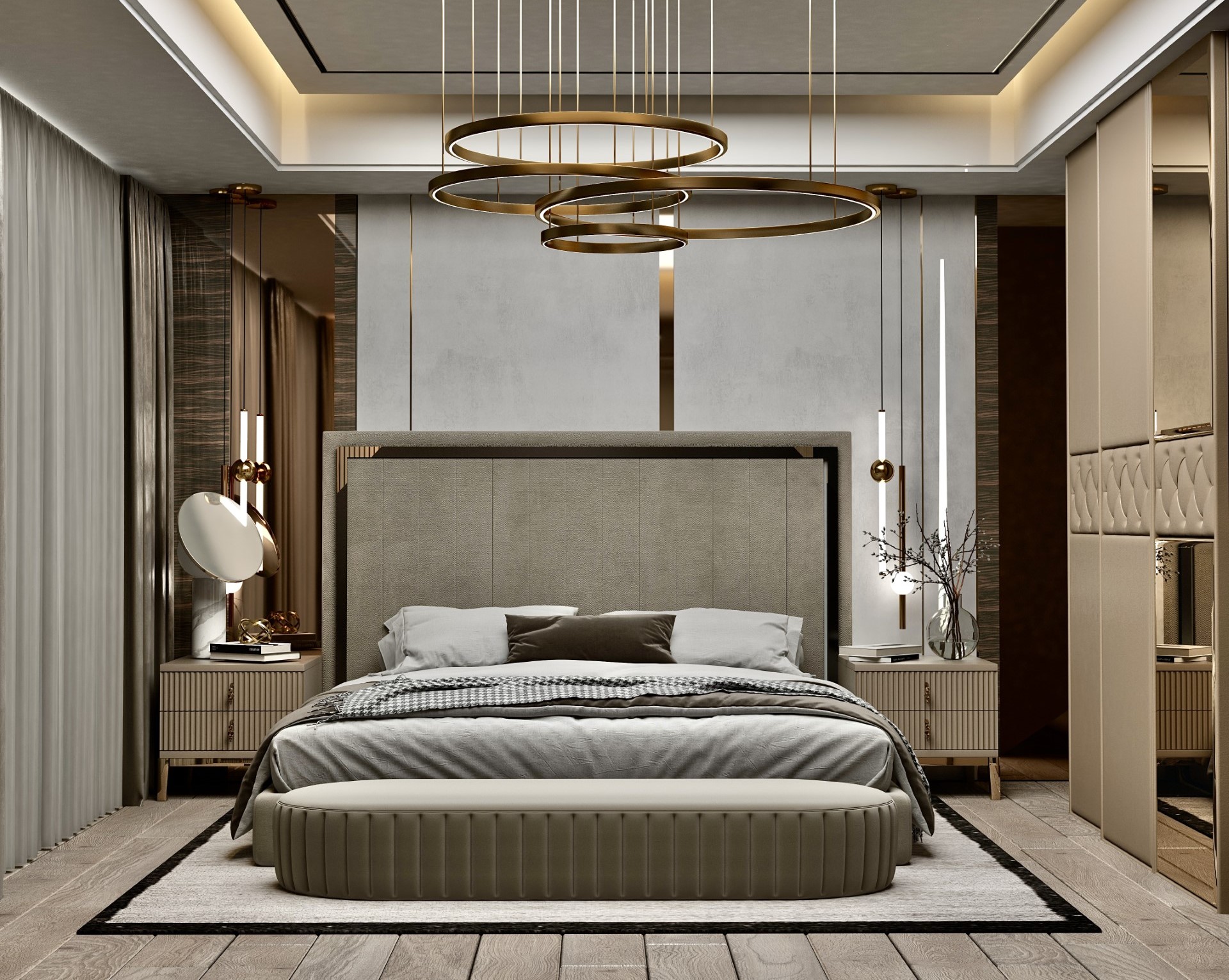 Avangart yatak odası tasarımı, dikkat çekici ve estetik olarak ilgi çekici bir tarzı temsil eder. Bu tarz genellikle sıradışı formlar, zengin detaylar, lüks malzemeler ve göz alıcı aksesuarlar kullanarak dikkat çeker. Avangart tarzında sıkça kullanılan renkler arasında altın, gümüş, bronz, krem, beyaz ve siyah gibi lüks ve sofistike tonlar bulunur. Tasarımımız da krem ve bronz renkleri kullanarak odanın zengin ve çağdaş bir görünüm kazanmasını sağladık. Büyük ve zarif mobilyalar avangarttarzının vazgeçilmezlerindendir. Duvardan duvara bronz detaylı yatak başlığı ve işlemeli mobilyalarla bu durumu sağladık. Avangart tarzı, zengin detaylarla bezeli olduğundan, odaya oymalı aynalar, zarif lambaderler, şık avizeler gibi dekoratif öğeler ekledik. Farklı doku ve malzemelerin karışımıyla derinlik ve zenginlik yaratabilirsiniz. Ahşap ve metal malzemelerin kombinasyonu ile odanın dokusunu zenginleştirilmiştir.Avangart tarzı karmaşıklığı içerebilir, ancak odanın sıkışık veya dağınık görünmemesine dikkat etmek önemlidir. Tasarımın bütünlüğünü koruyarak, odanın karakterini ve ifadesi belirlenmiştir. Her detayın tasarım diline uyum sağlamasına dikkat edildi.
